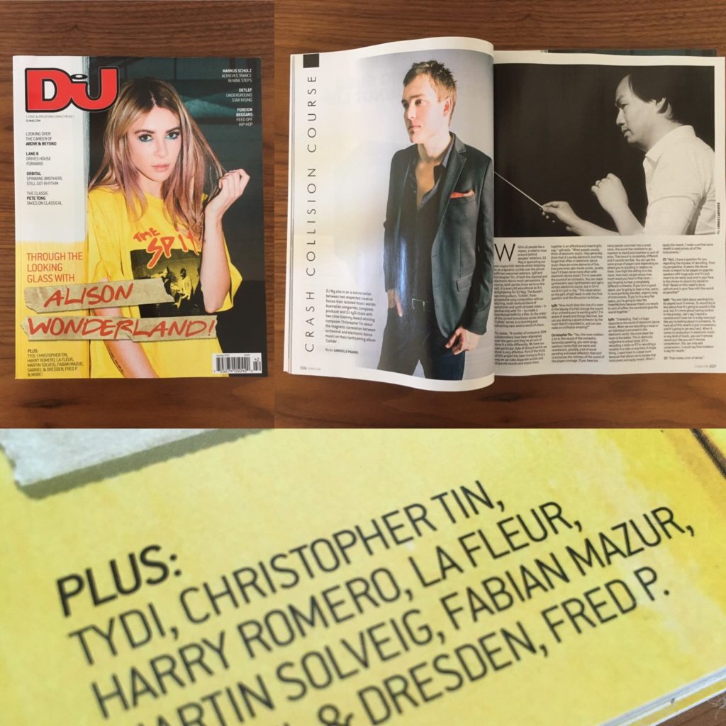 … and wind up in random places. Like on the cover of DJ Magazine! Last year an EDM producer named TyDi approached me to do a collaborative EDM-meets-orchestra album. No pay or anything, let’s just write some songs and see what happens. So I said why not? We spent months writing an album called ‘Collide’, which comes out March 9th. And among other media outlets, DJ Magazine picked it up, gave us a three-page spread, and featured us on the cover of their January edition!