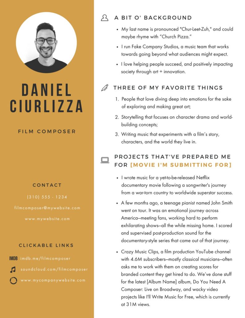 My name’s Daniel and I’m a composer and sound designer [hyperlink to your website on “I’m a composer and sound designer”]. I’ve been a long-time fan of the way you provide so much value to the people you work with – particularly with your film scores (something I love to do) [hyperlink to your IMDb (if you have one) on “something I love to do”]. You and your team have accomplished a lot of fantastic work and I’m really interested in your future goals.